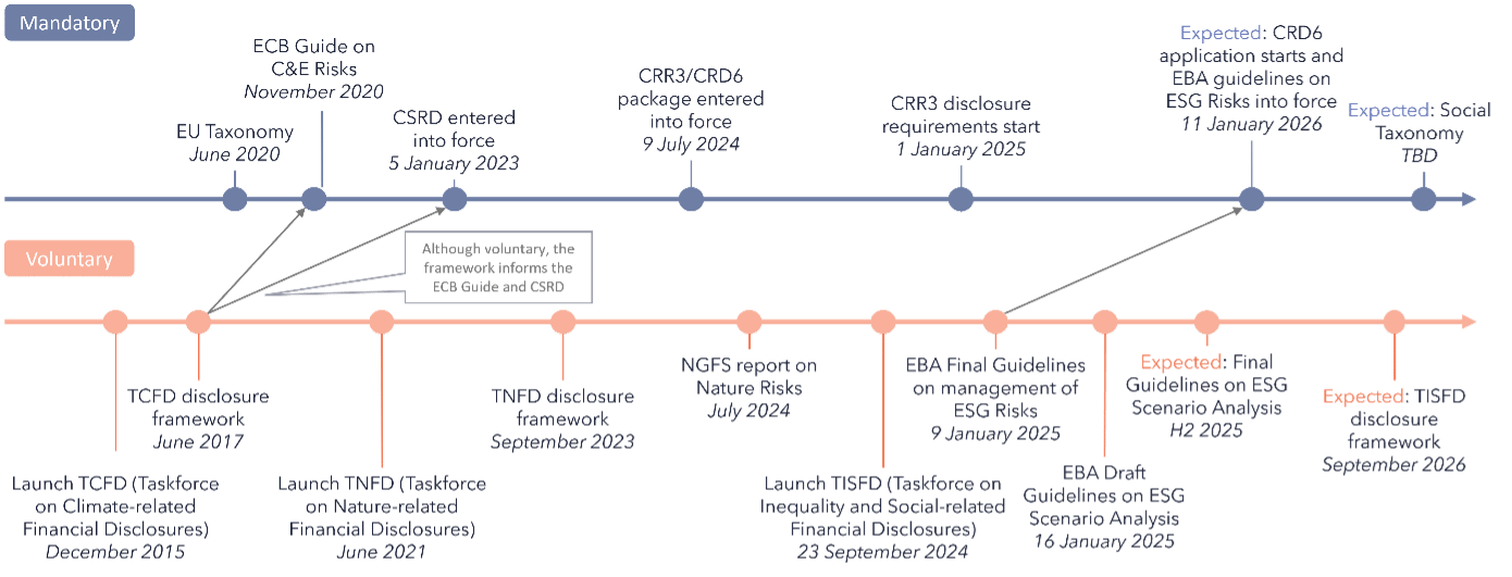 It provides clear criteria for sustainable activities, thereby guiding businesses and financial institutions toward sustainable decision-making. Moreover, the disclosure framework published by the Taskforce on Climate-related Financial Disclosures (TCFD), while voluntary, has informed regulatory frameworks like the ECB Guide and the CSRD, thereby pushing organizations to enhance transparency regarding climate-related risks. Looking ahead, the integration of climate risks into CRR3/CRD6 will further enhance the incorporation of climate risks into financial institutions’ risk management frameworks. Similarly, the EBA Guidelines on the management of ESG risks, published on 9 January 2025, and the recently published EBA Draft Guidelines on ESG Scenario Analysis, currently open for consultation until 16 April 2025, are both anticipated to take effect on 11 January 2026, providing additional support for this progression.